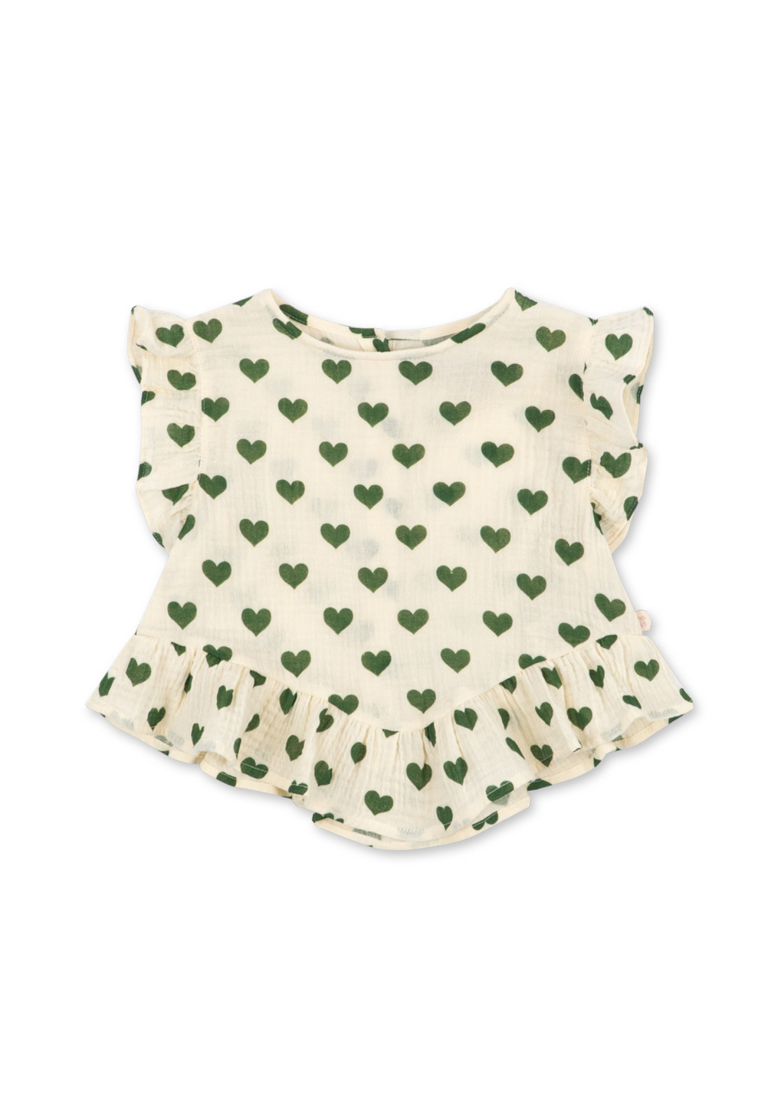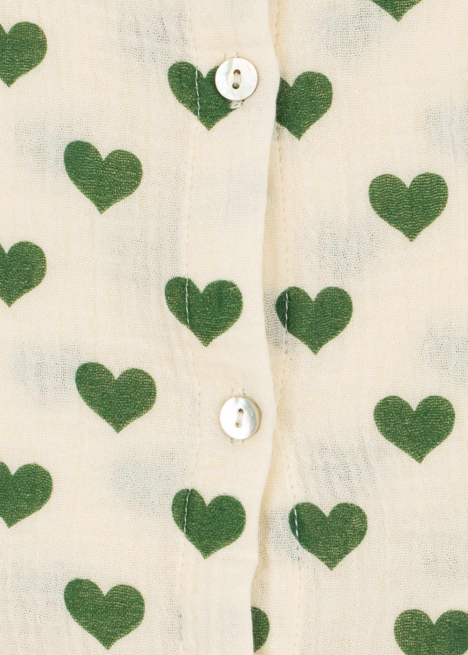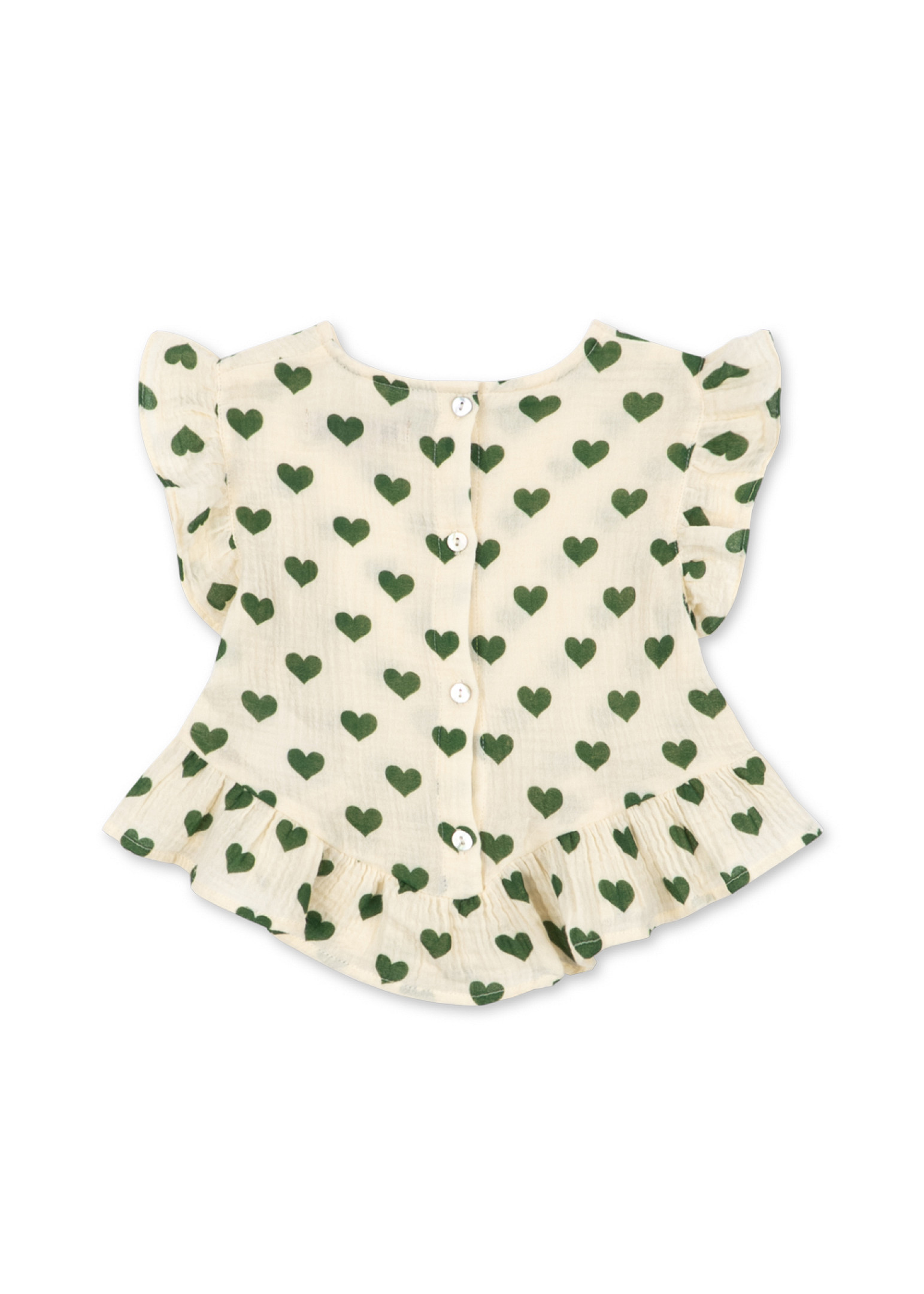 Minkštas viršus iš lengvos ir kvėpuojančios muslino medžiagos. „Coco“ viršus pasižymi subtiliu peplumo siluetu su subtiliu sijono efektu. Užsegamas viena saga nugaroje. Pagaminta iš 100 % ekologiškos medvilnės.