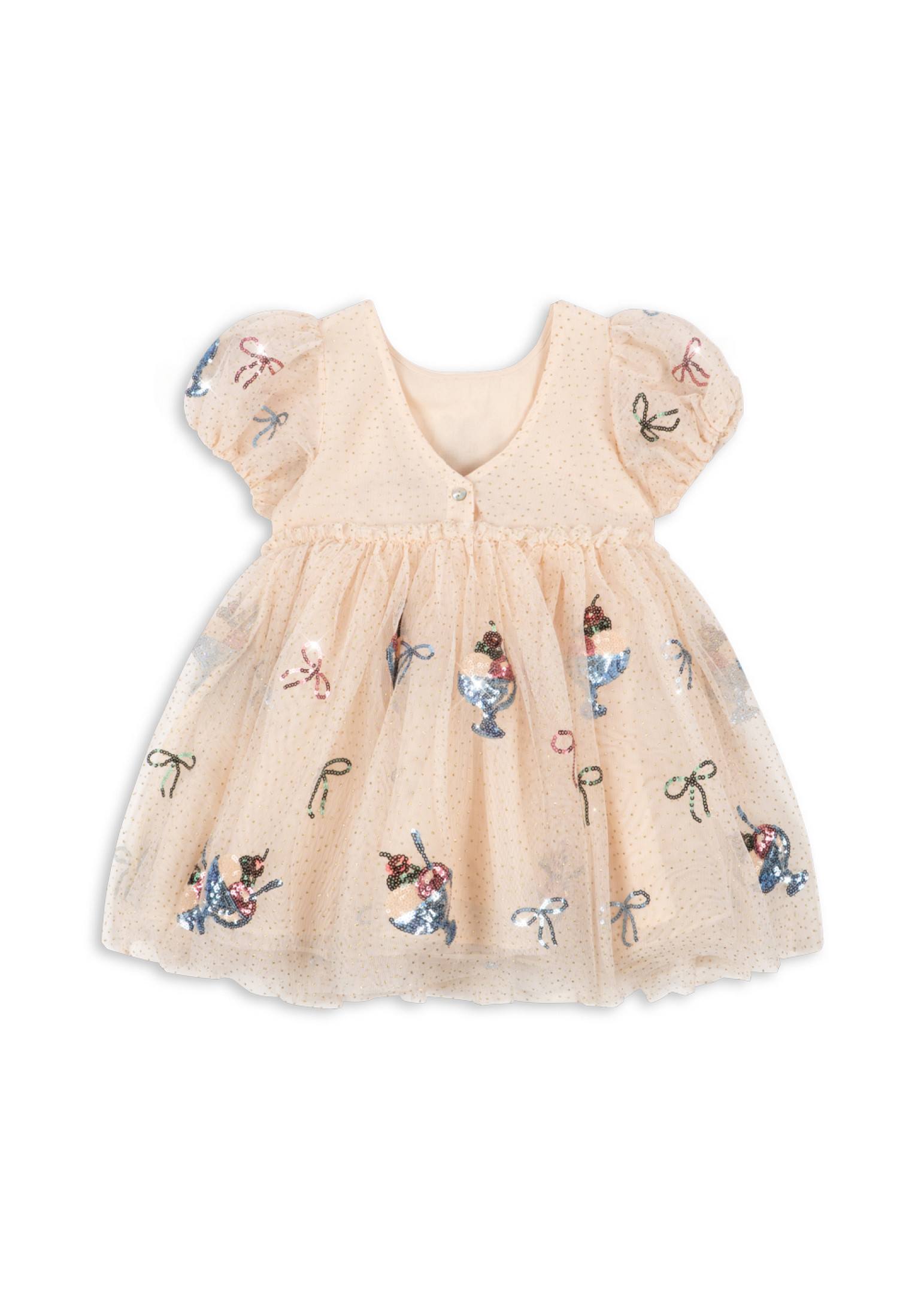 Plati tiulio suknelė trumpomis pūstomis rankovėmis. Suknelė yra laisvo silueto, su sijonu, kuris plevėsuoja ir siūbuoja šokant ir žaidžiant, o dekoratyviniai blizgučių siuvinėjimai suteikia tobulą užbaigtumą. Pamušalas minkštas medvilninis, kad būtų patogu dėvėti.