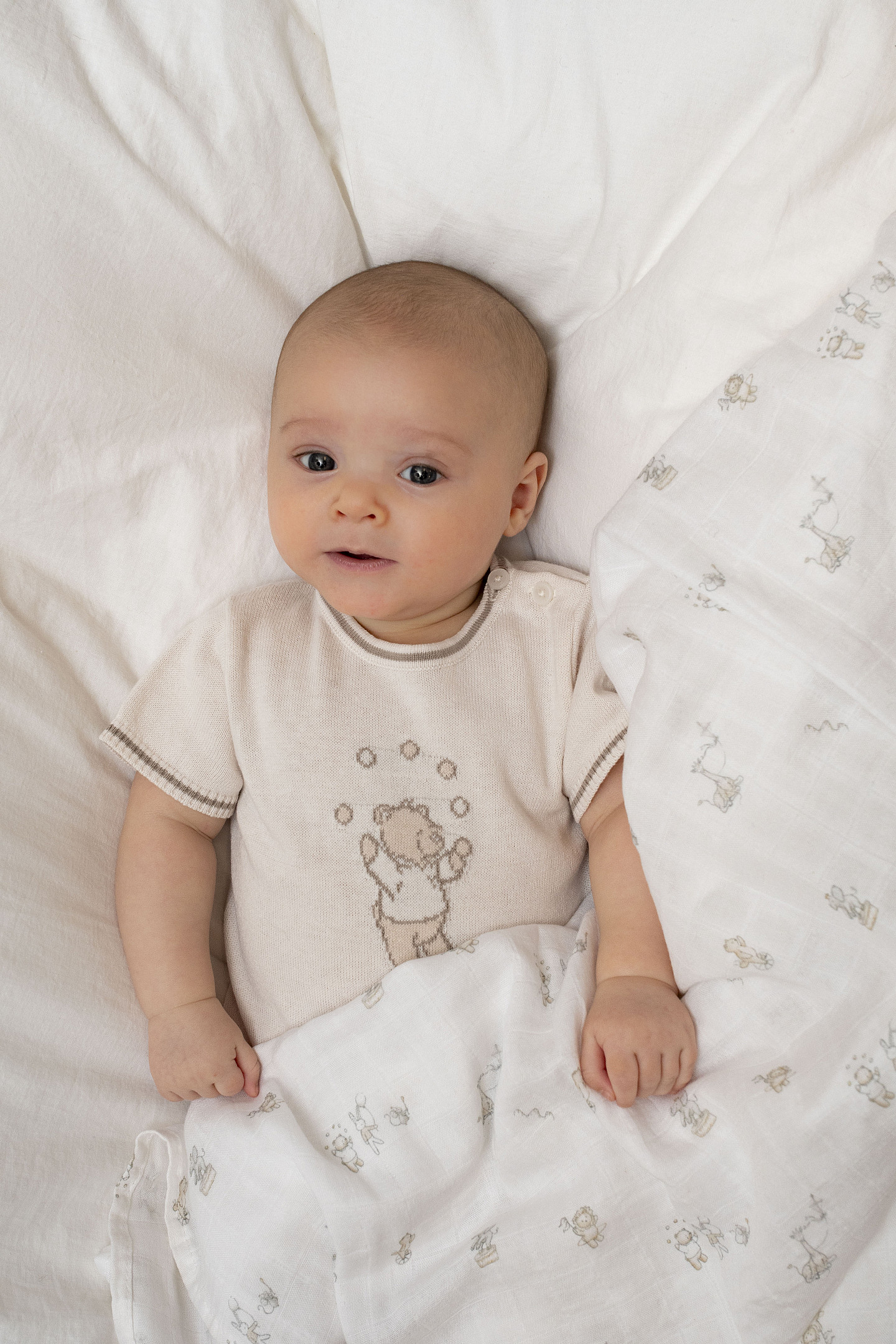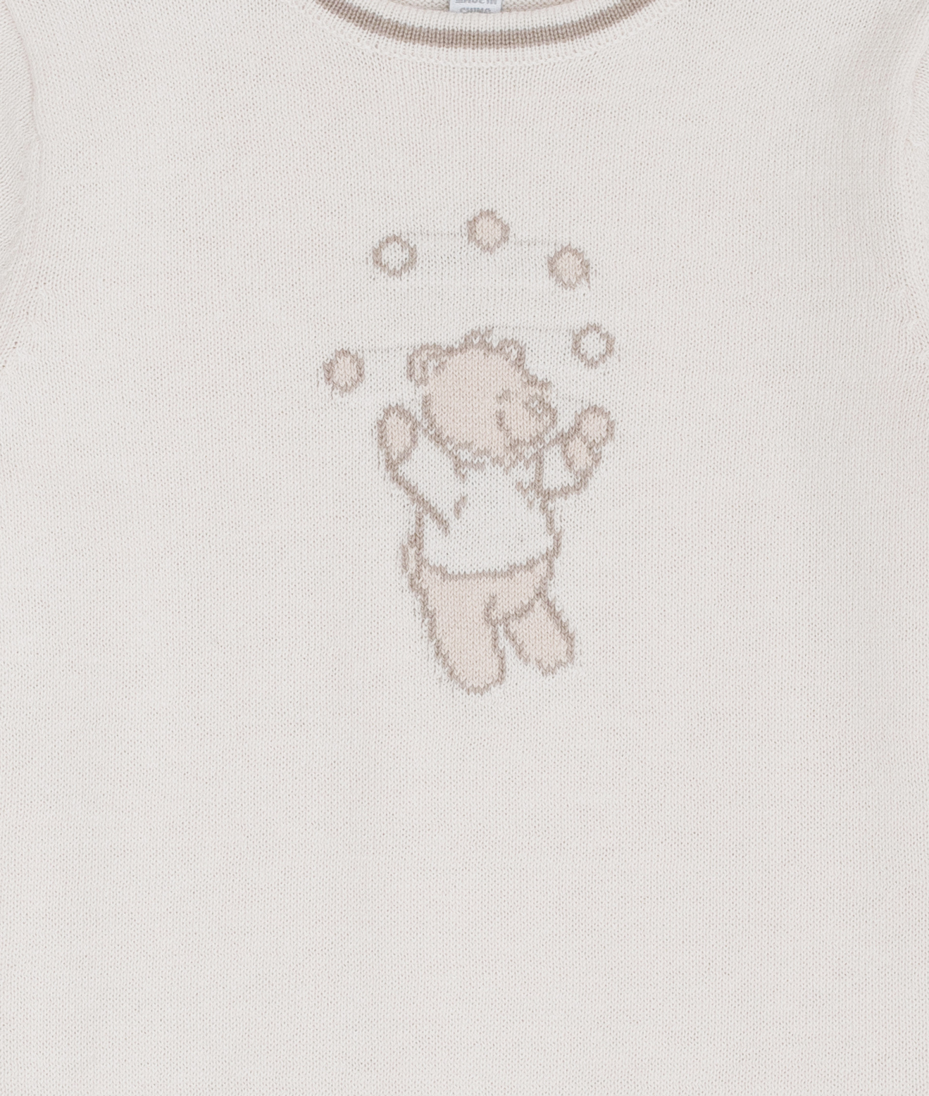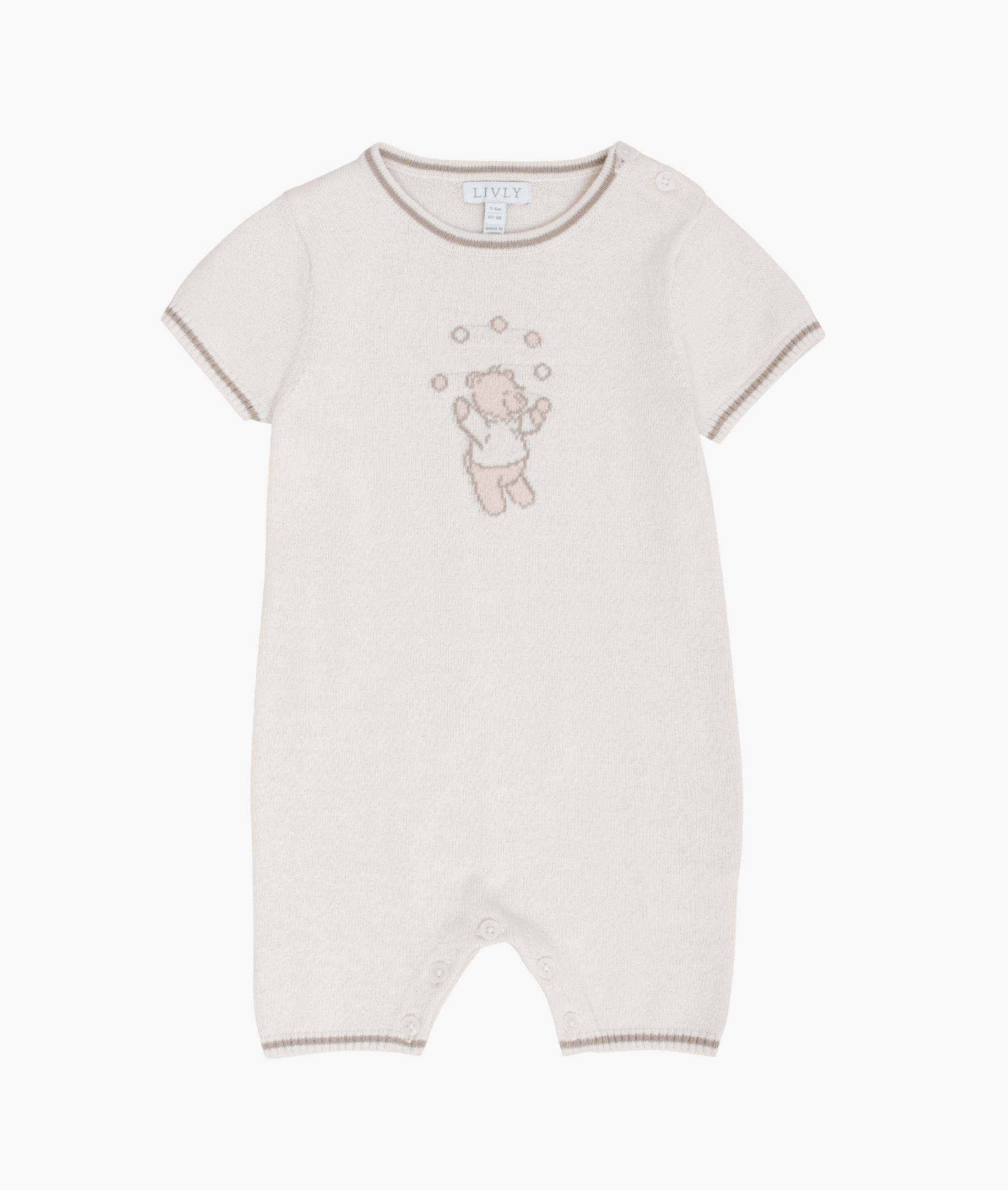 Kupinas žavesio ir jaukumo bei minkštumo, megztas romperis pasižymi trumpomis rankovėmis, laisvo kirpimo ir mieliausiu žongliruojančio meškučio paveikslėliu priekyje. Pagamintas iš minkšto mezginio, kad būtų patogus visą dieną, jis puikiai tinka žaidimams, glamonėms ir viskam, kas tarp jų – džiaugsmingas drabužis jūsų mažylio kasdieniams nuotykiams.