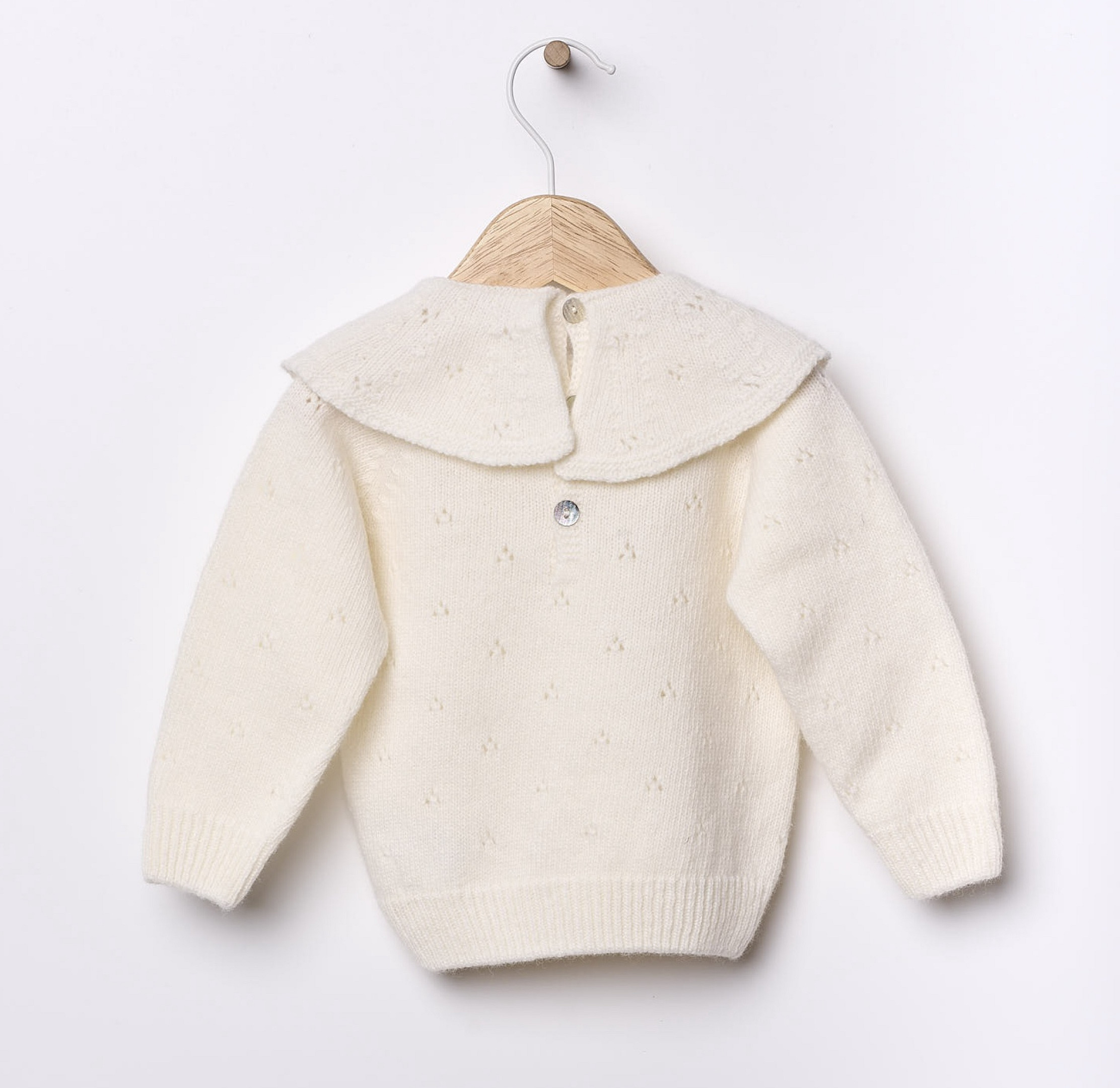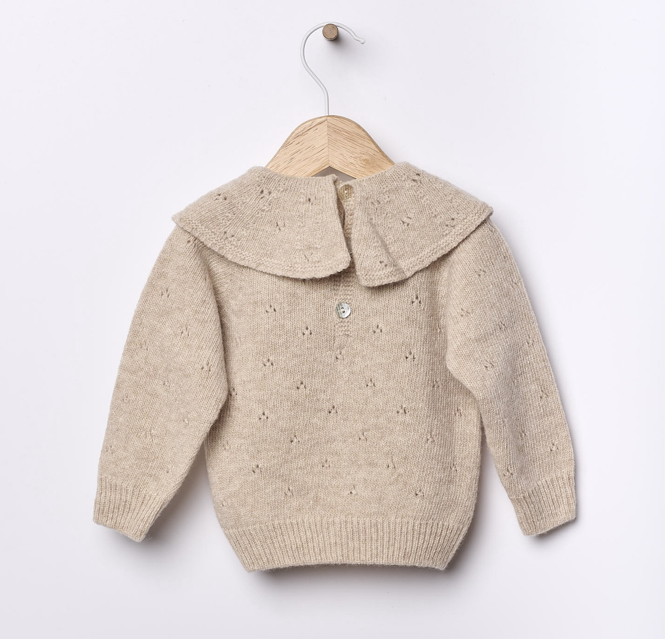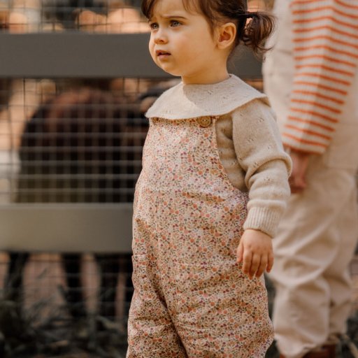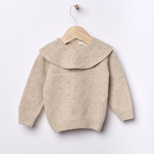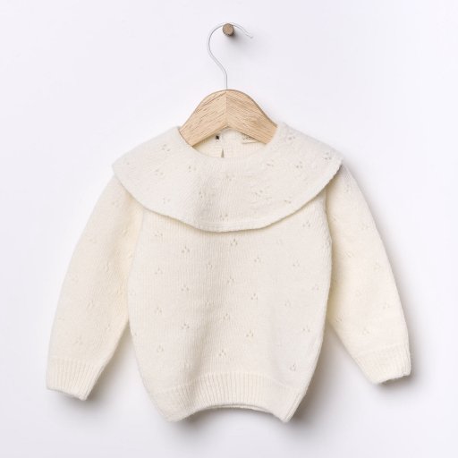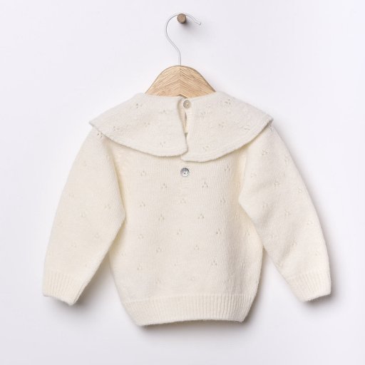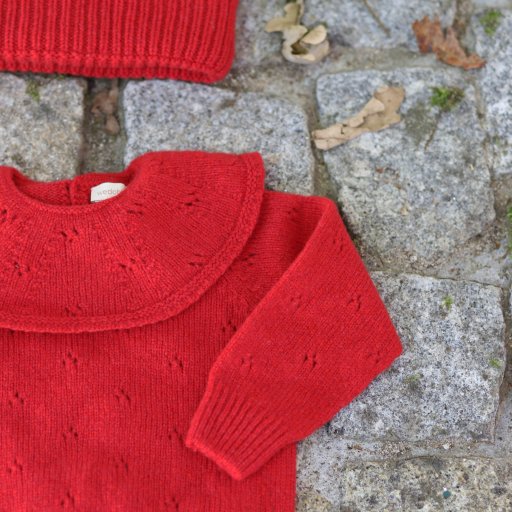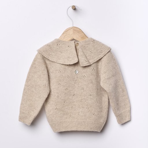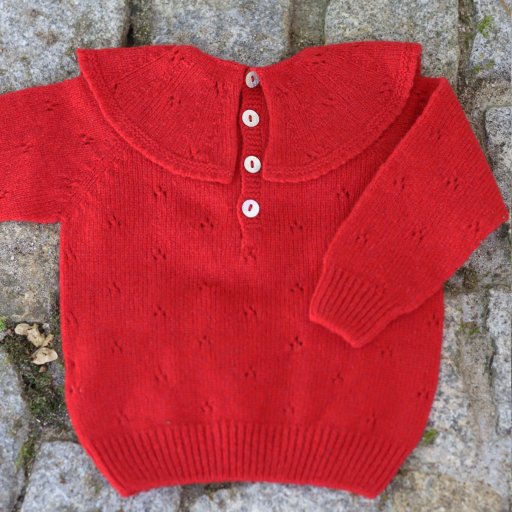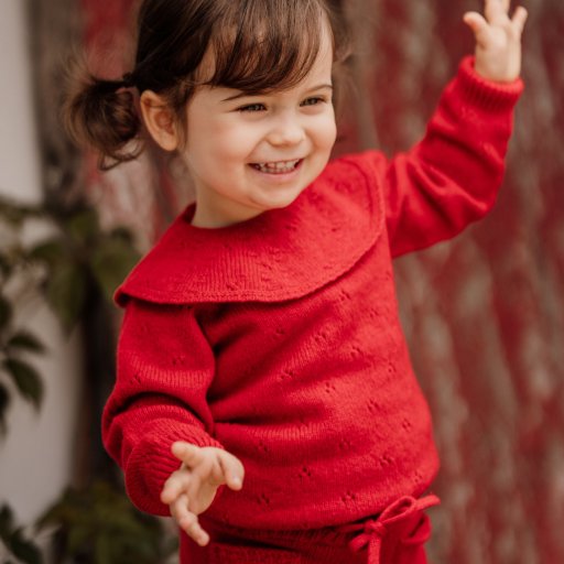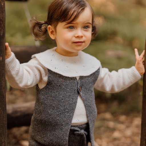 Megztinis megztas iš nuostabios, itin plonos merino vilnos. Ilgarankovis „Laiminga“ megztinis užsegamas perlamutrinėmis sagomis nugaroje. Pagamintas naudojant „Wholegarment“ technologiją, šis megztinis yra besiūlis, kad jūsų vaikas jaustųsi kuo patogiau.