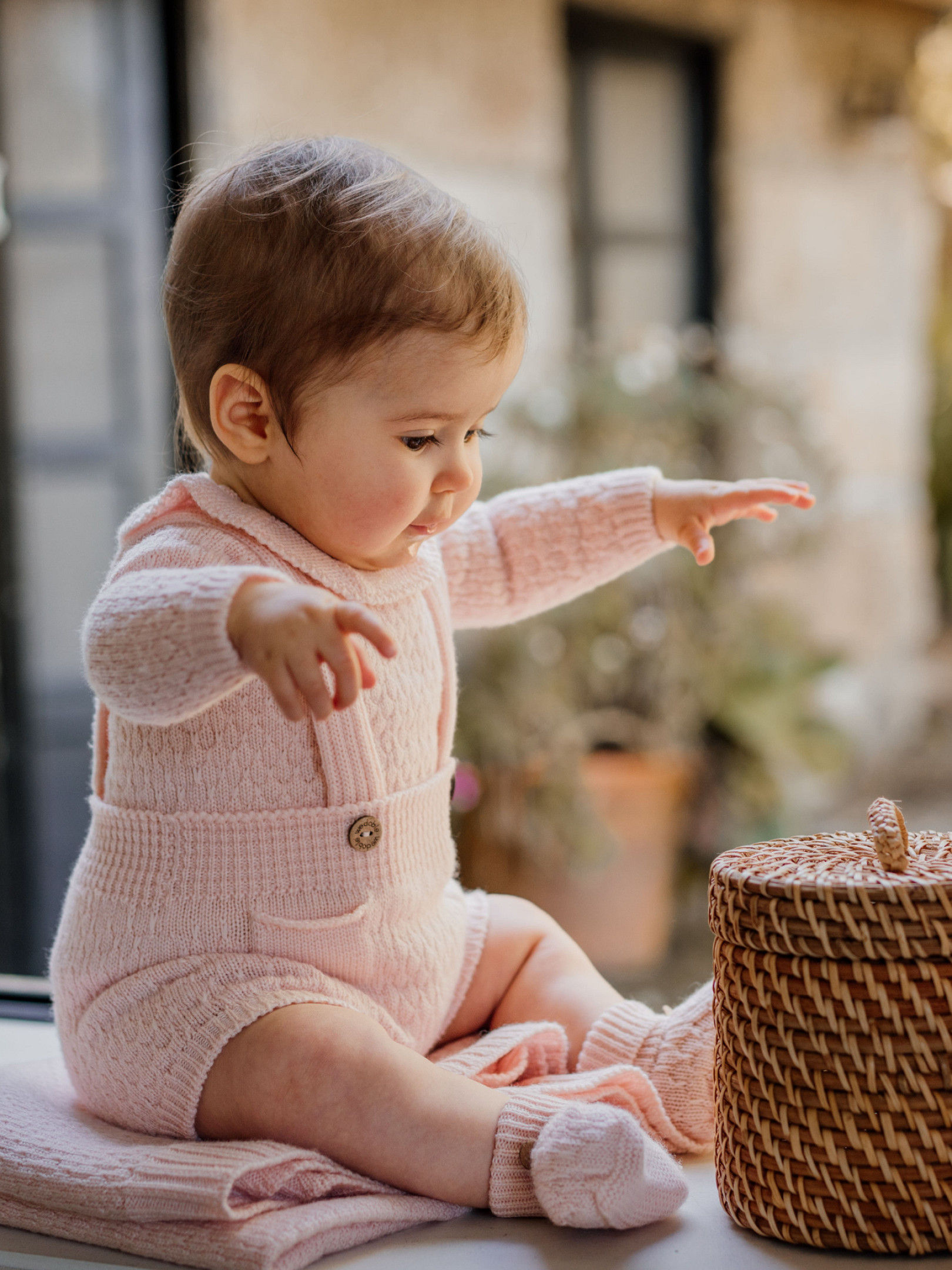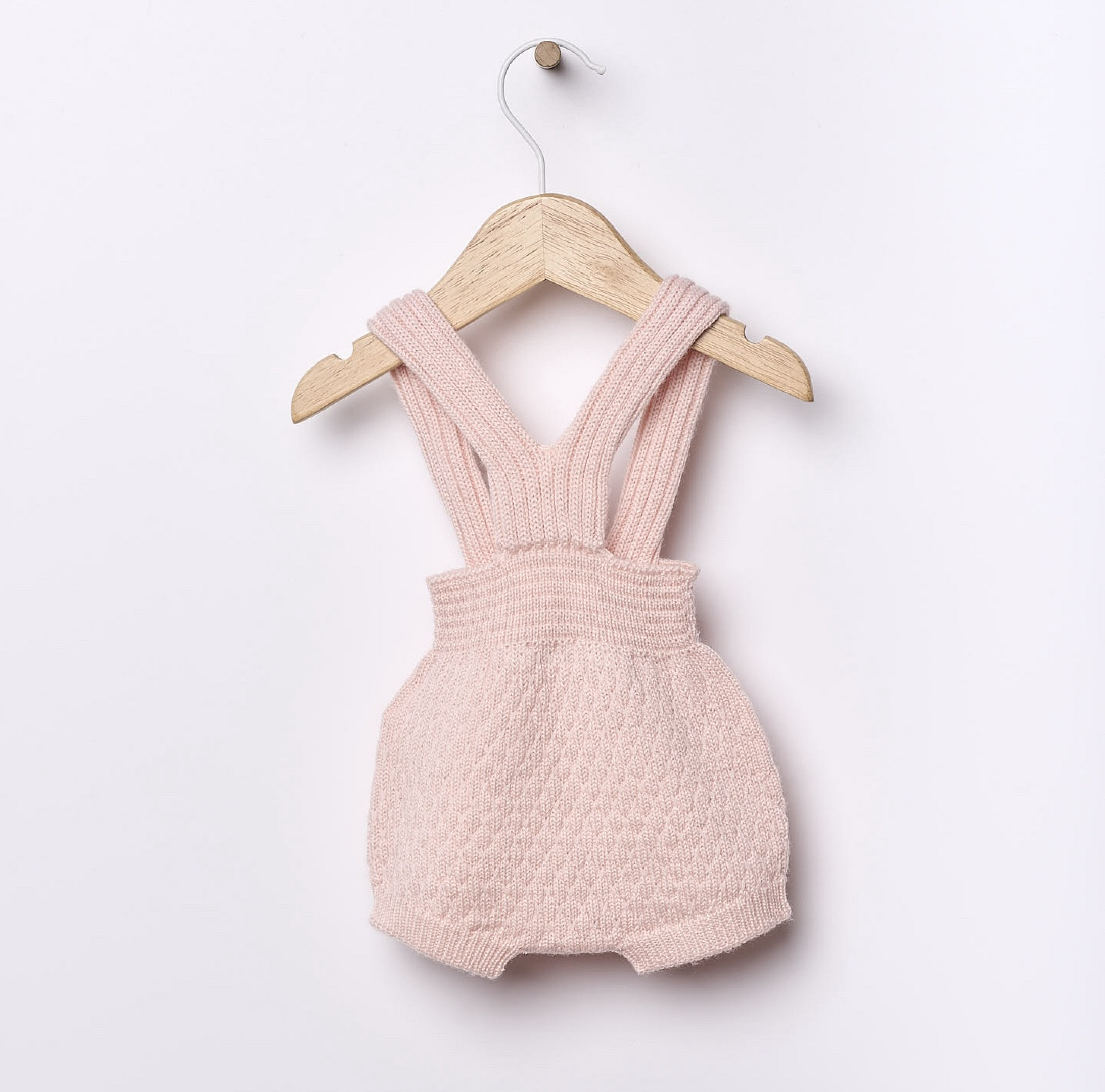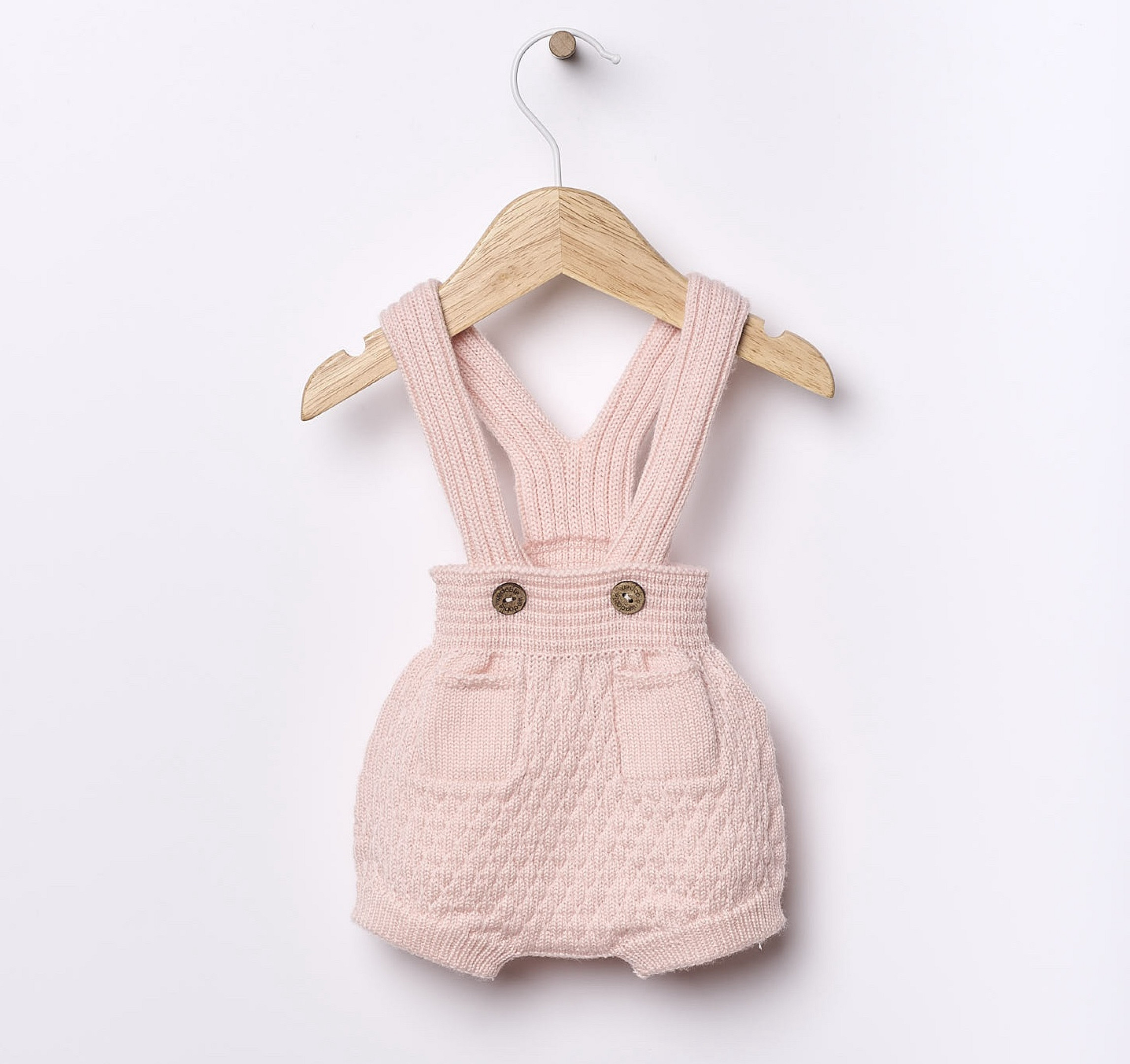 Iš minkštos merino vilnos megzti šortukai su petnešėlėmis. „Jaukumas” užsegamas kokoso sagomis. Pagamintas naudojant „Wholegarment“ technologiją, šis drabužis yra besiūlis, kad jūsų kūdikis jaustųsi kuo patogiau.