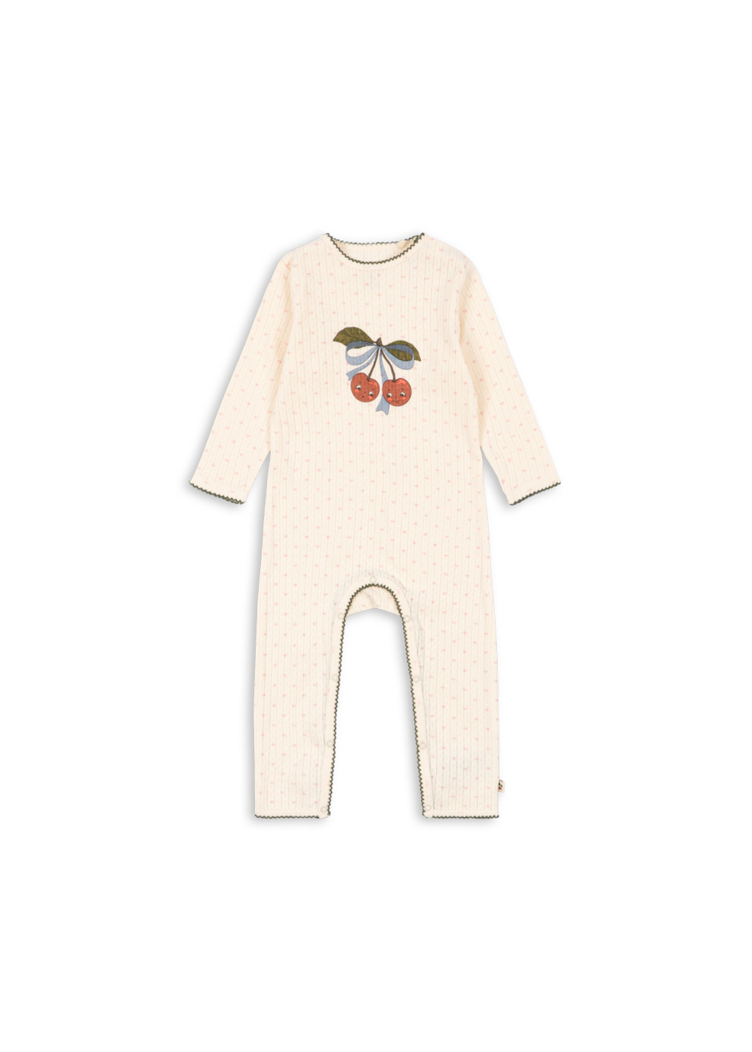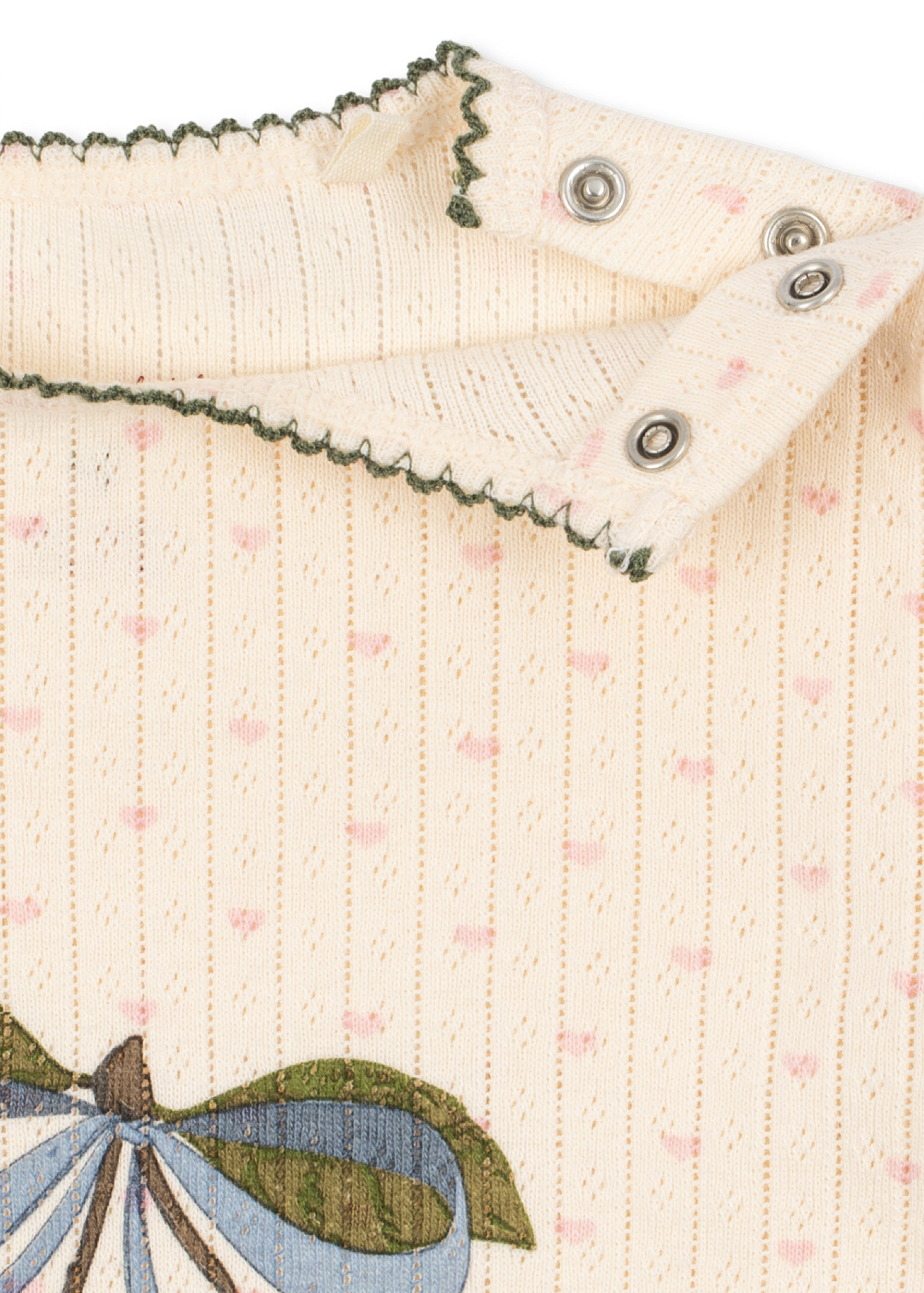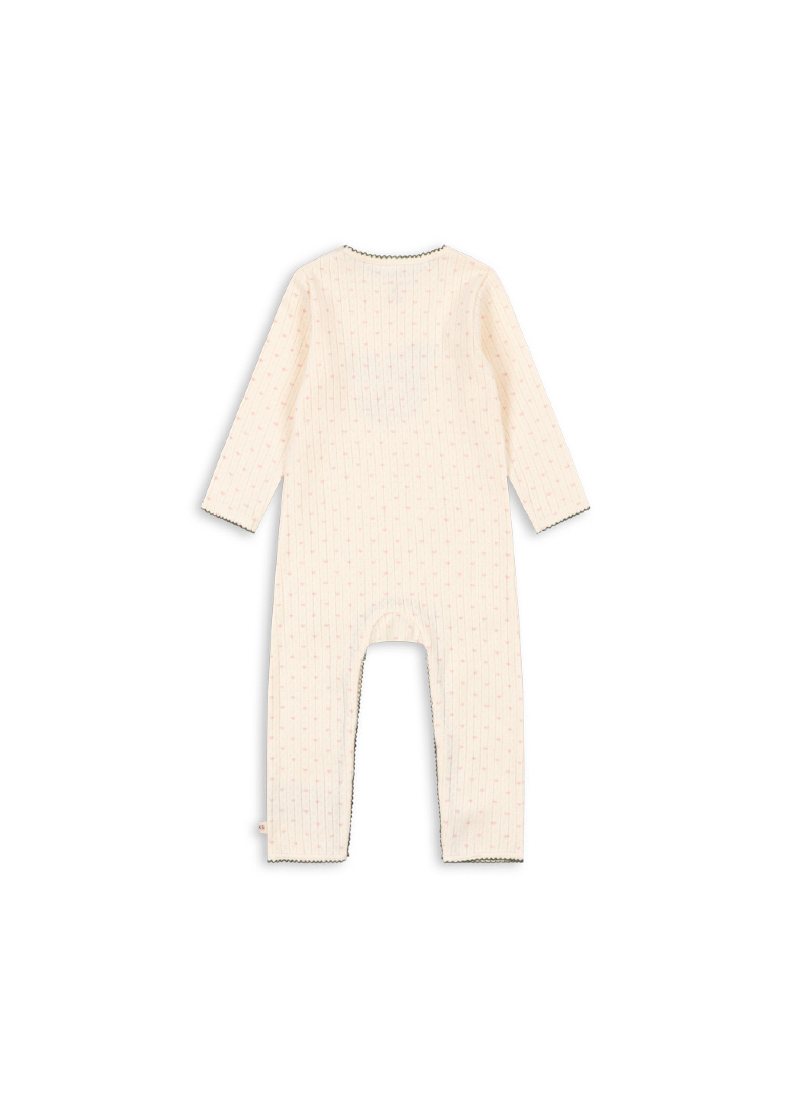 Klasikinis kombinezonas, pasiūtas iš kvėpuojančios ekologiškos medvilnės. Turi spaudes palei kojas, kad būtų lengva apsirengti. „Minnie“ – tai mūsų klasikinė būtiniausių drabužių linija, pasiūta iš minkštos ekologiškos medvilnės. Šie būtiniausi drabužiai skirti dėvėti tiek dieną, tiek naktį kaip patogus sluoksnis prie odos, o visas jų paviršius dekoruotas dekoratyviniu raštu.