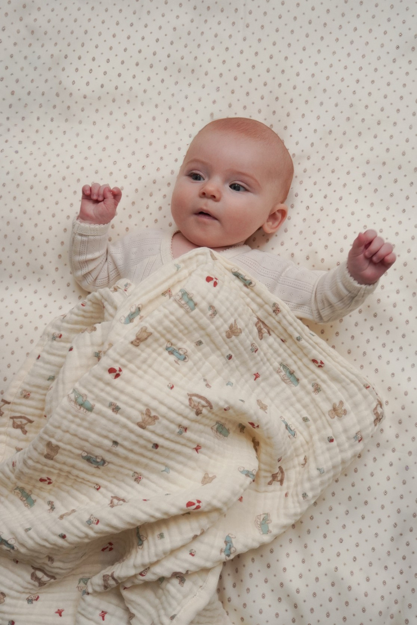 Itin minkštas ir kvėpuojantis pledukas, pagamintas iš keturių lengvos, ekologiškos, GOTS sertifikuotos medvilnės sluoksnių.
