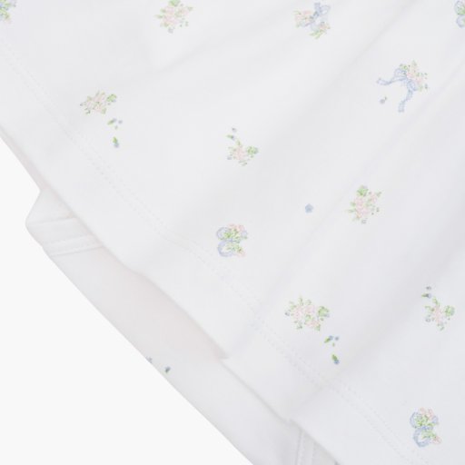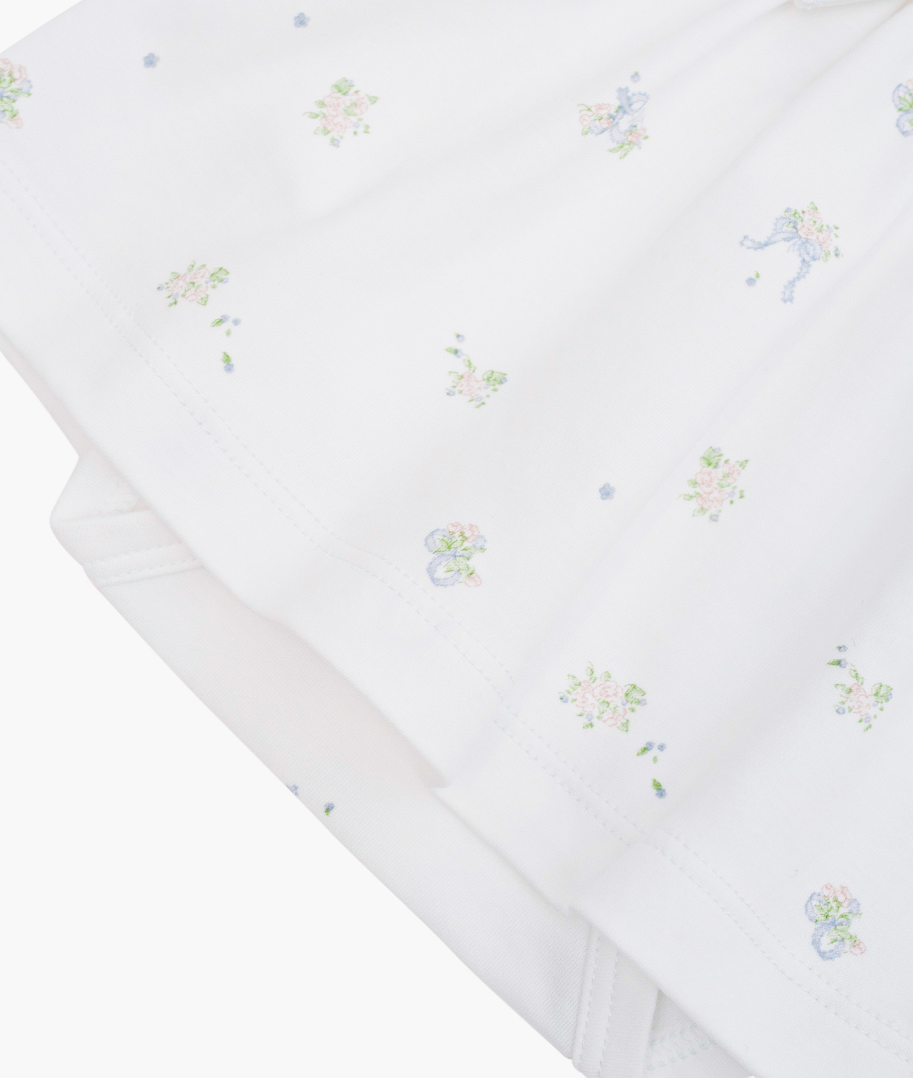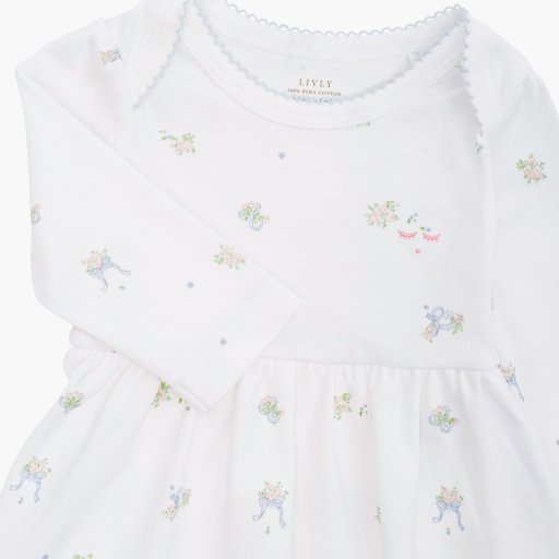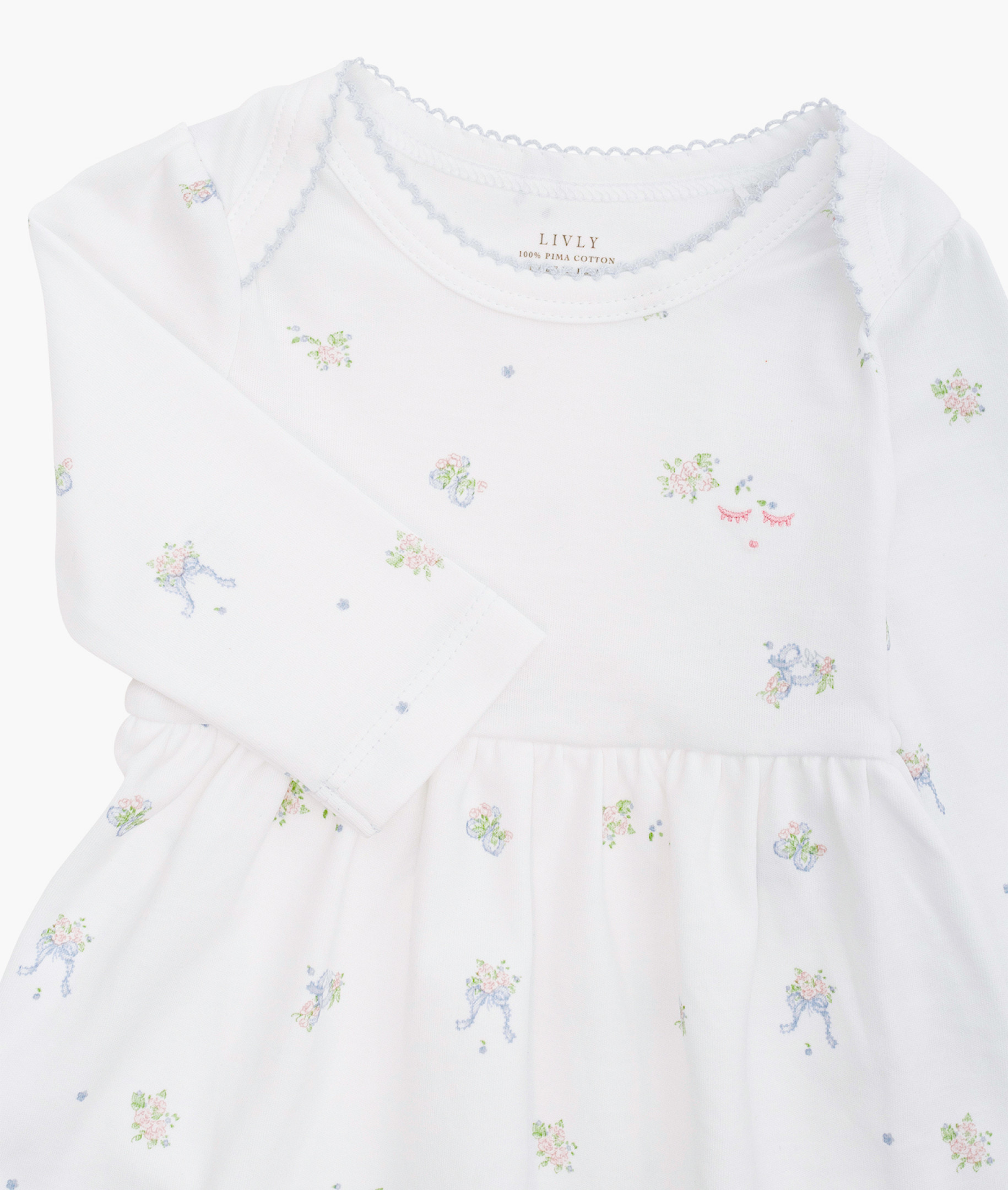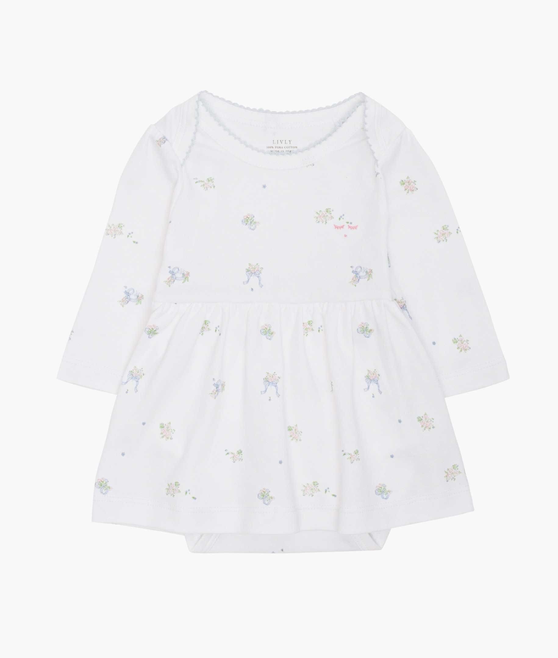 Maža suknelė, skirta svarbioms akimirkoms. Kūdikio suknelė pasiūta iš minkščiausios hipoalerginės Pima medvilnės ir papuošta rankomis tapytu gėlių ir kaspinų raštu. Ilgos rankovės ir švelnus kirpimas užtikrins, kad jūsų kūdikiui būtų jauku ir atrodytų nepaprastai mielai nuo rytinių apkabinimų iki popietinių pasivaikščiojimų.