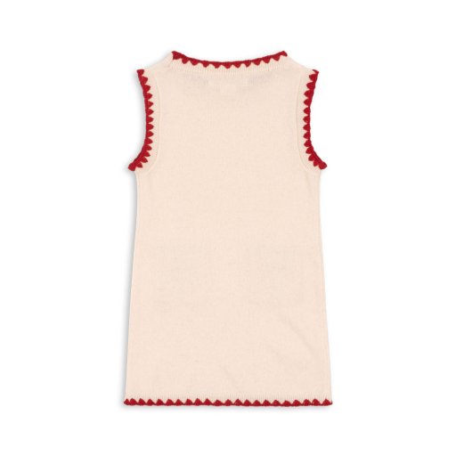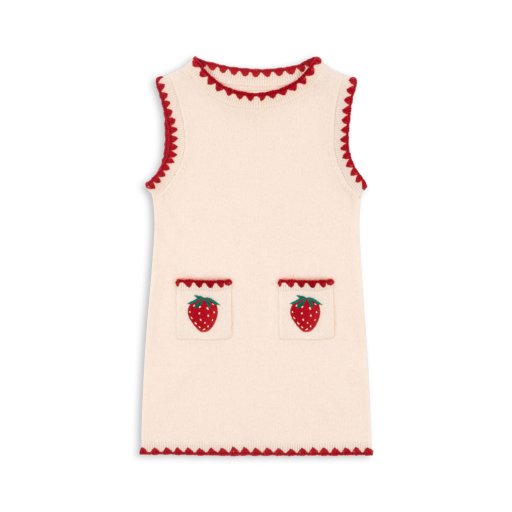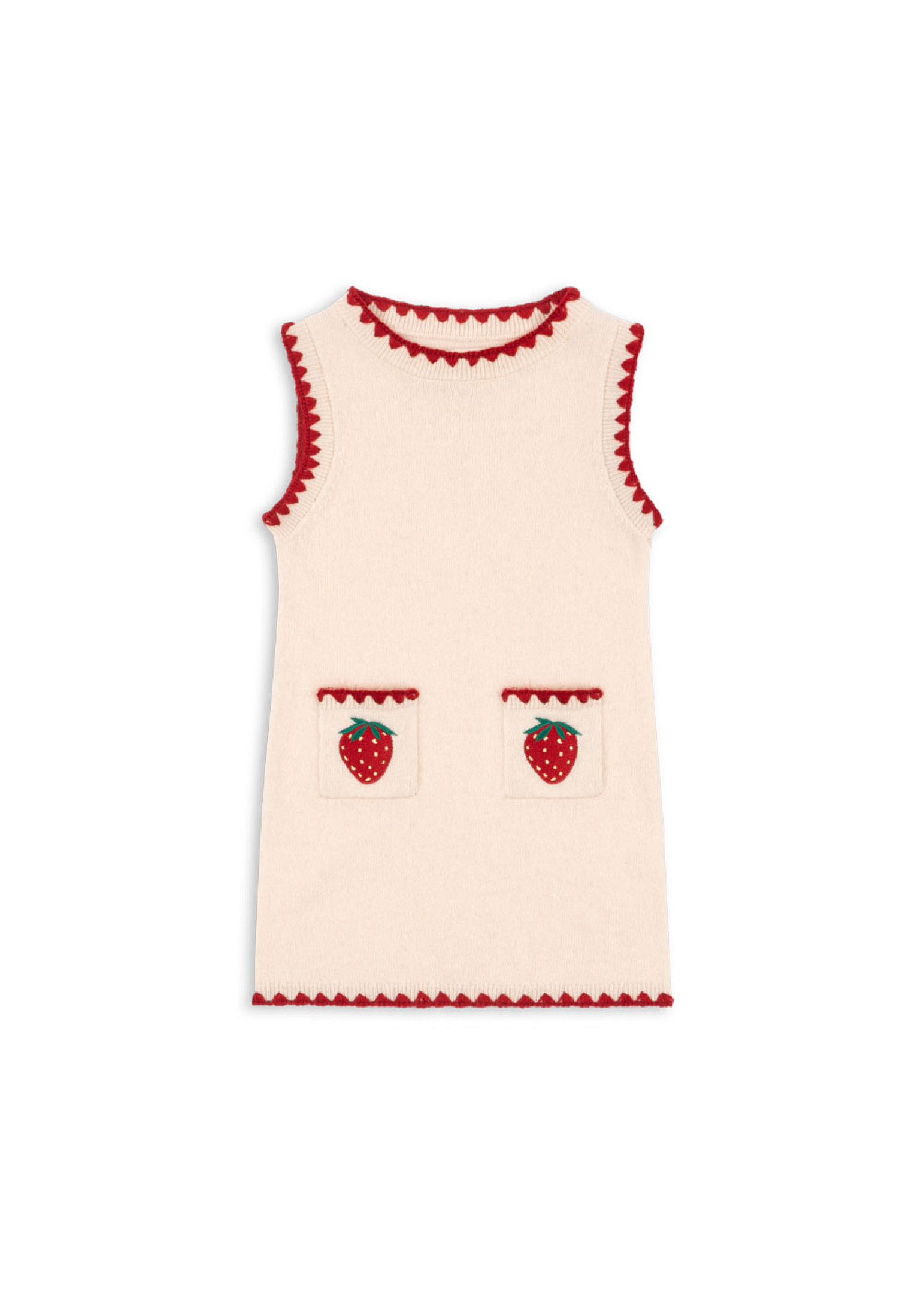 Megzta vilnonė suknelė iš itin minkštos ir patogios medžiagos, su subtiliu braškių rašto siuvinėjimu. Su priekinėmis kišenėmis ir tiesaus, priglundančio silueto.